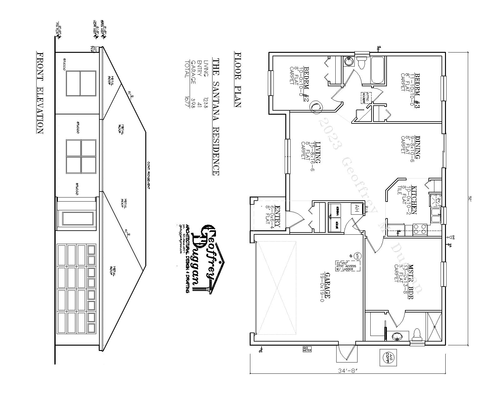 The Santana Residence, to be built in Crescent, Florida, on a wooded lot on a narrow backroad. This houseis a three Bedroom, two Bath, two car Garage single story residence featuring an open Great Room design. This cozy design will make a great starter home.