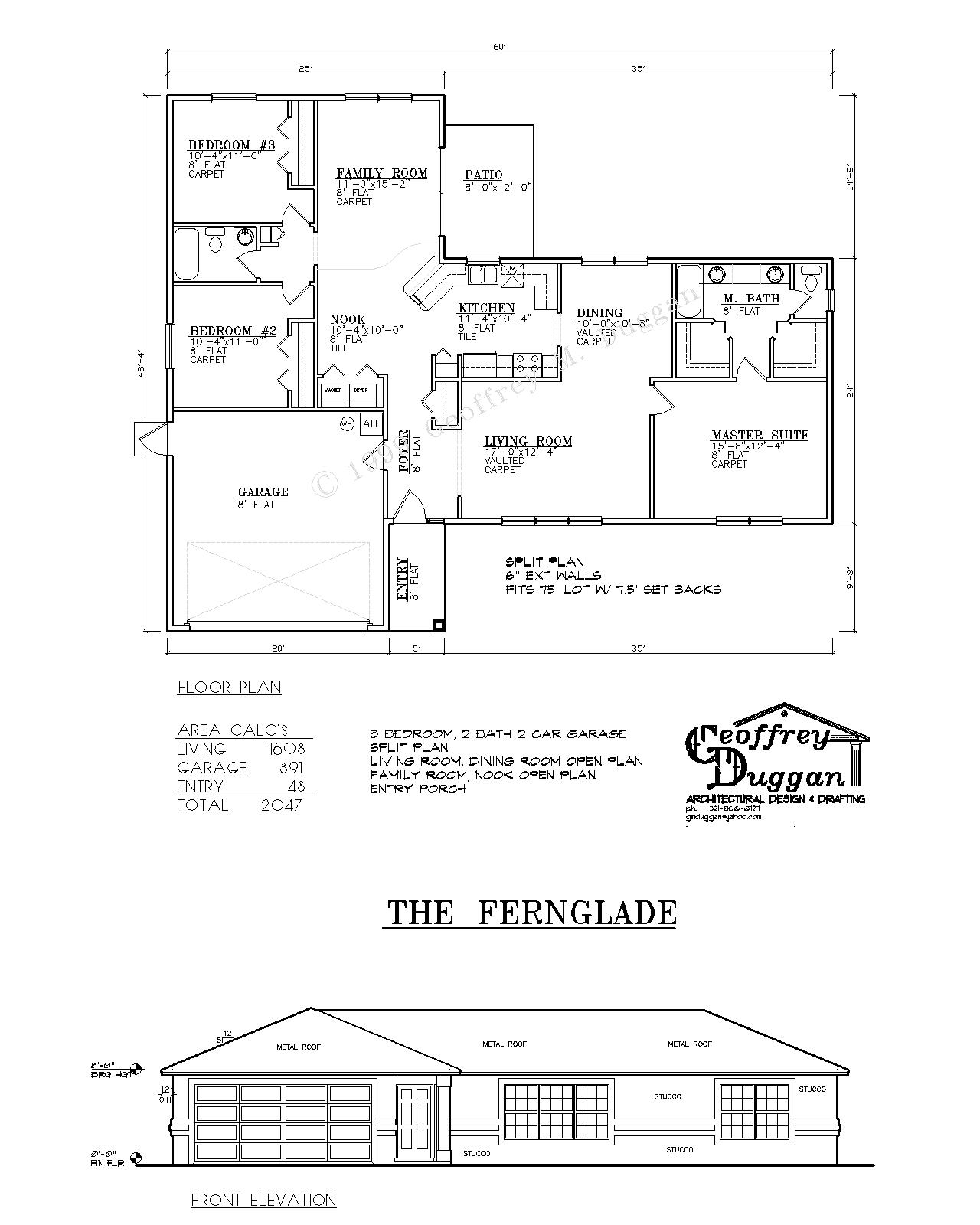The Fernglade is a three Bedroom, two Bath, two car Garage single story residence with 1608 sf living and 2047 sf total, designed for the Central Florida market. The Fernglade features a split plan of Great Room and Dining Room, Family room and Nook, a Galley Kitchen, and an inviting Entry Porch.